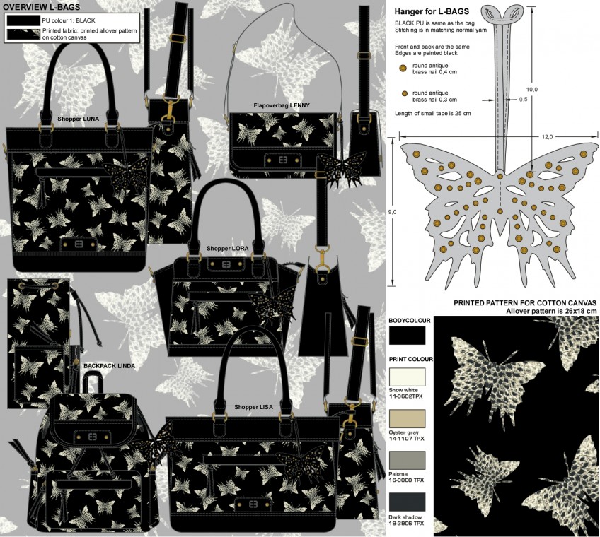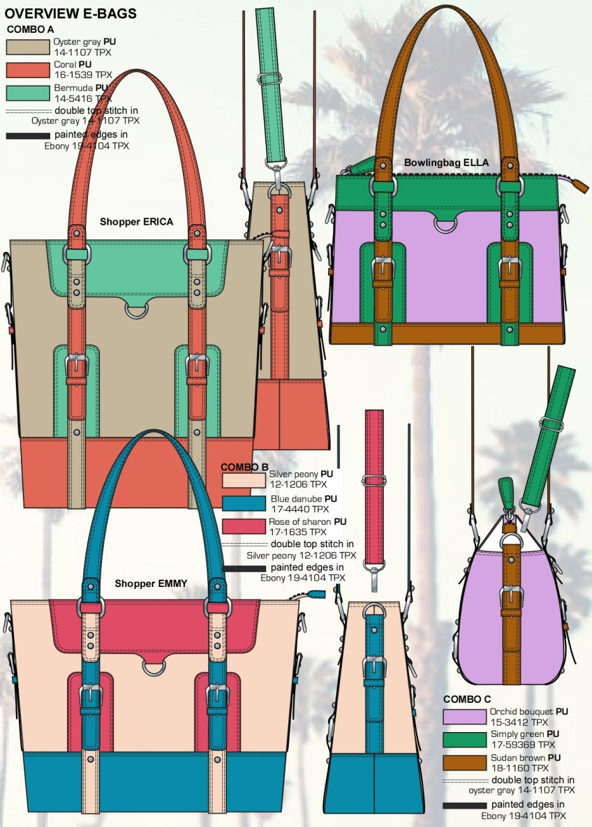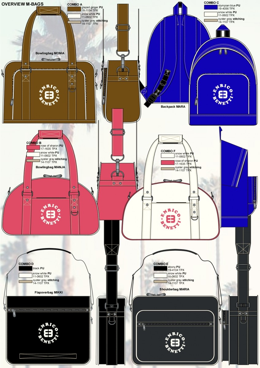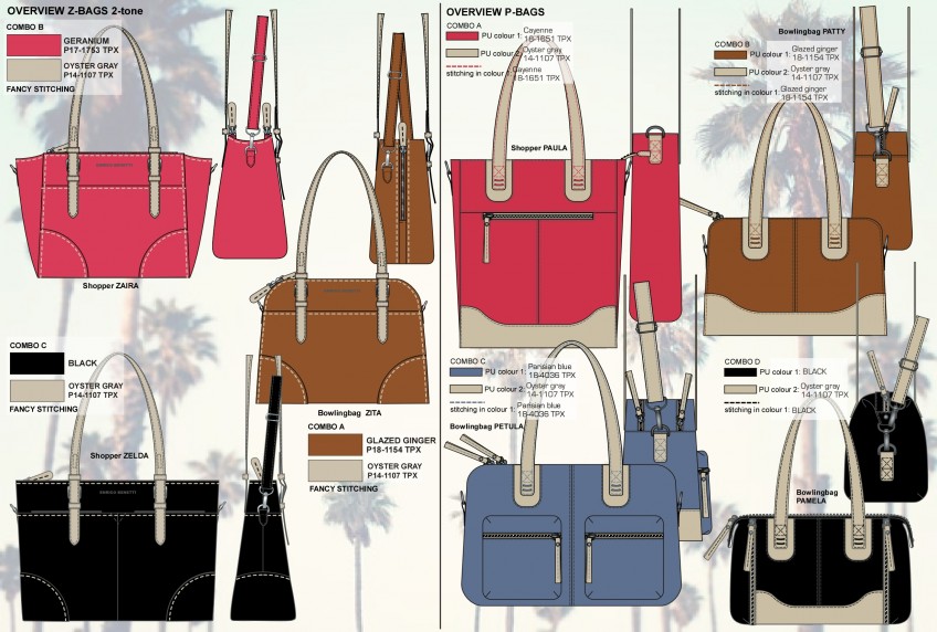 I have designed bags for over 15 years for different clients, it is one of my specialties. And I think bags are a very interesting product and I like to draw them very much. Mostly I have designed ladies bags, but schoolbags (including printed patterns) and sportsbags I also drew a lot. This is a very small selection.