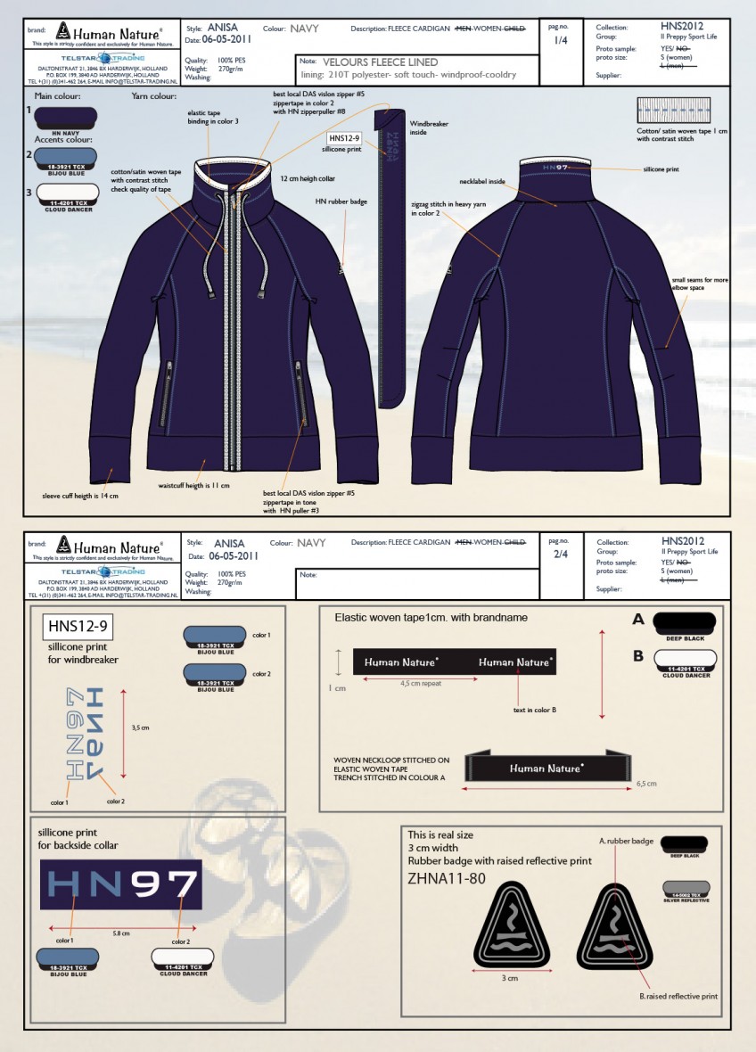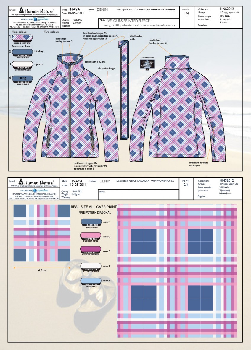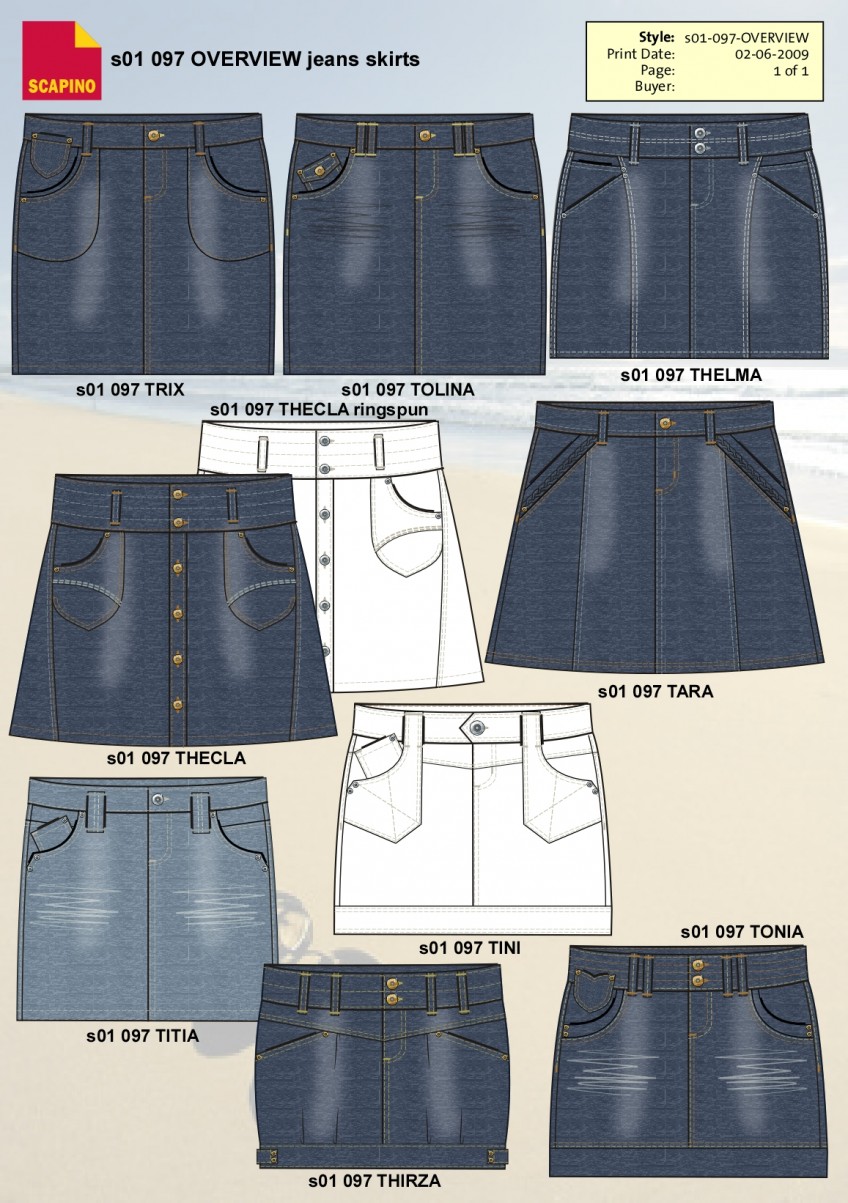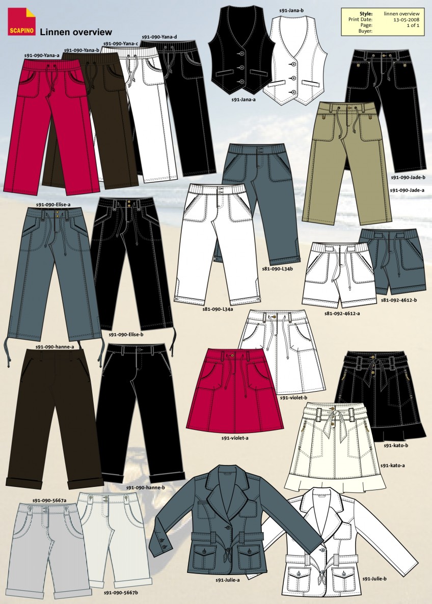 I have designed the whole spectrum of products for women, such as coats, jackets, shirts, sweats, pulls, pants, skirts, etc. Including patterns, prints, labels and hangtags.