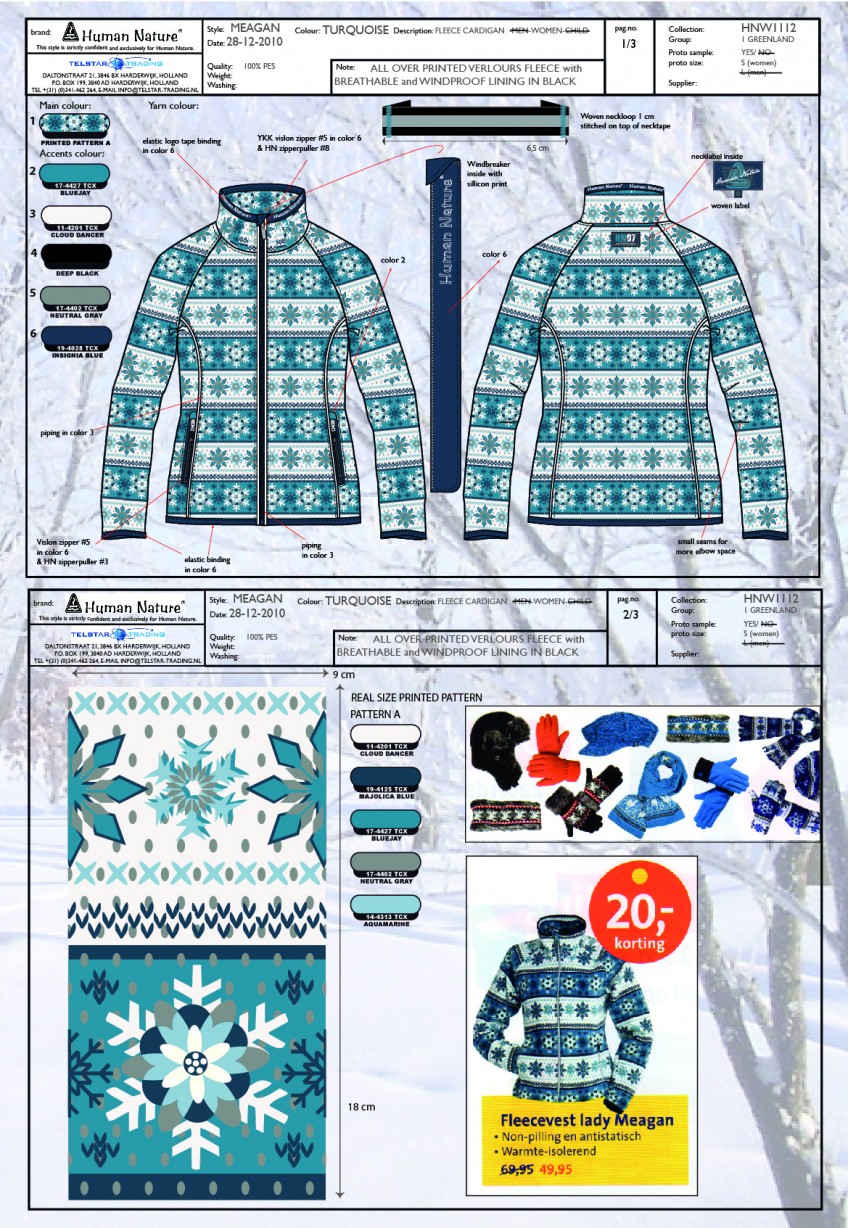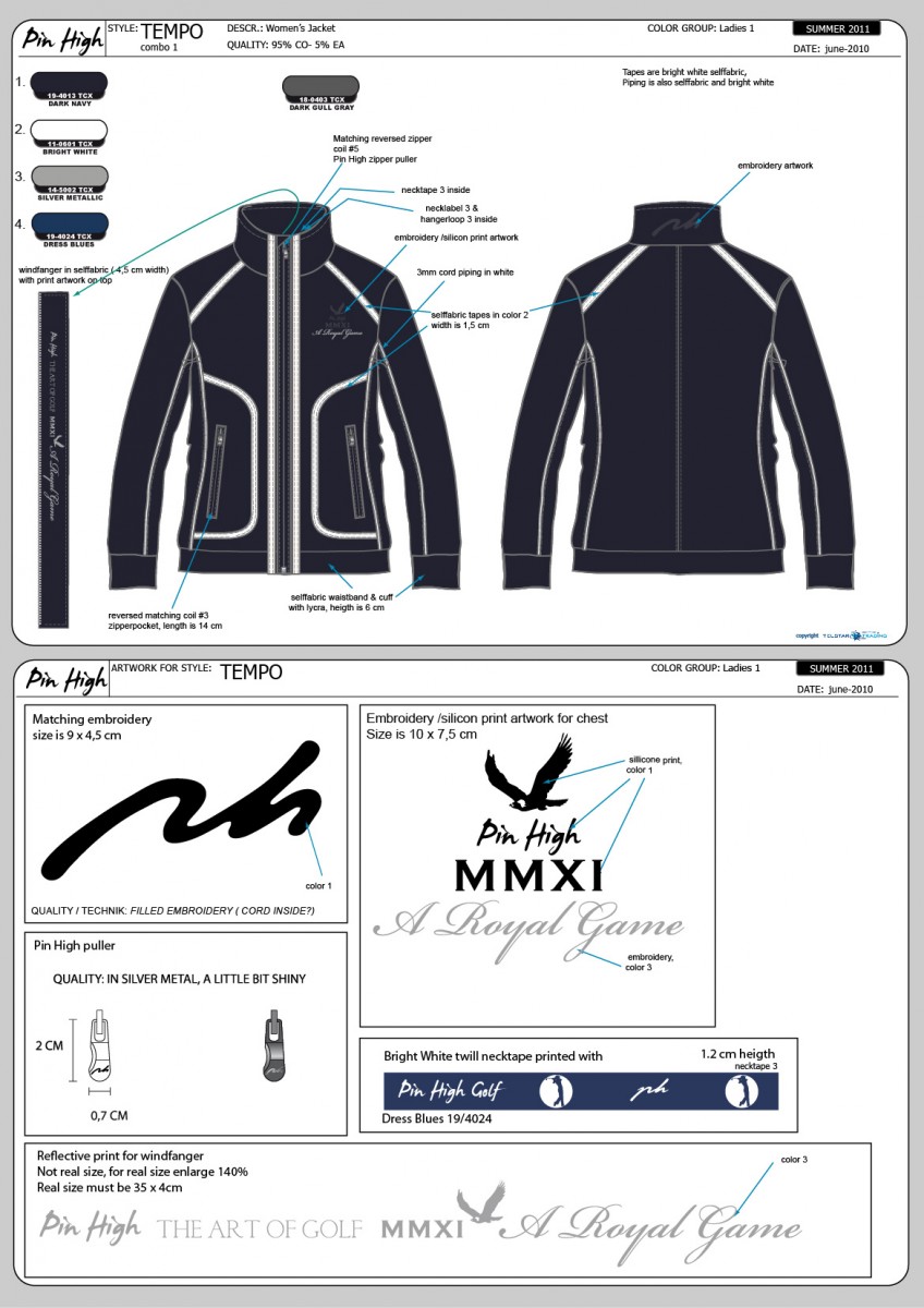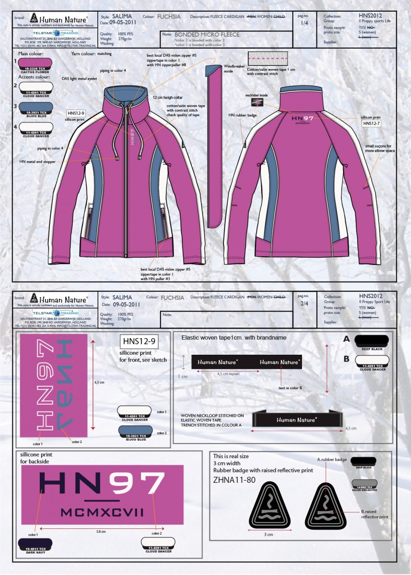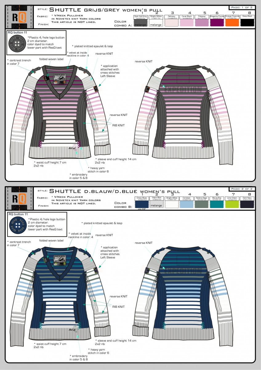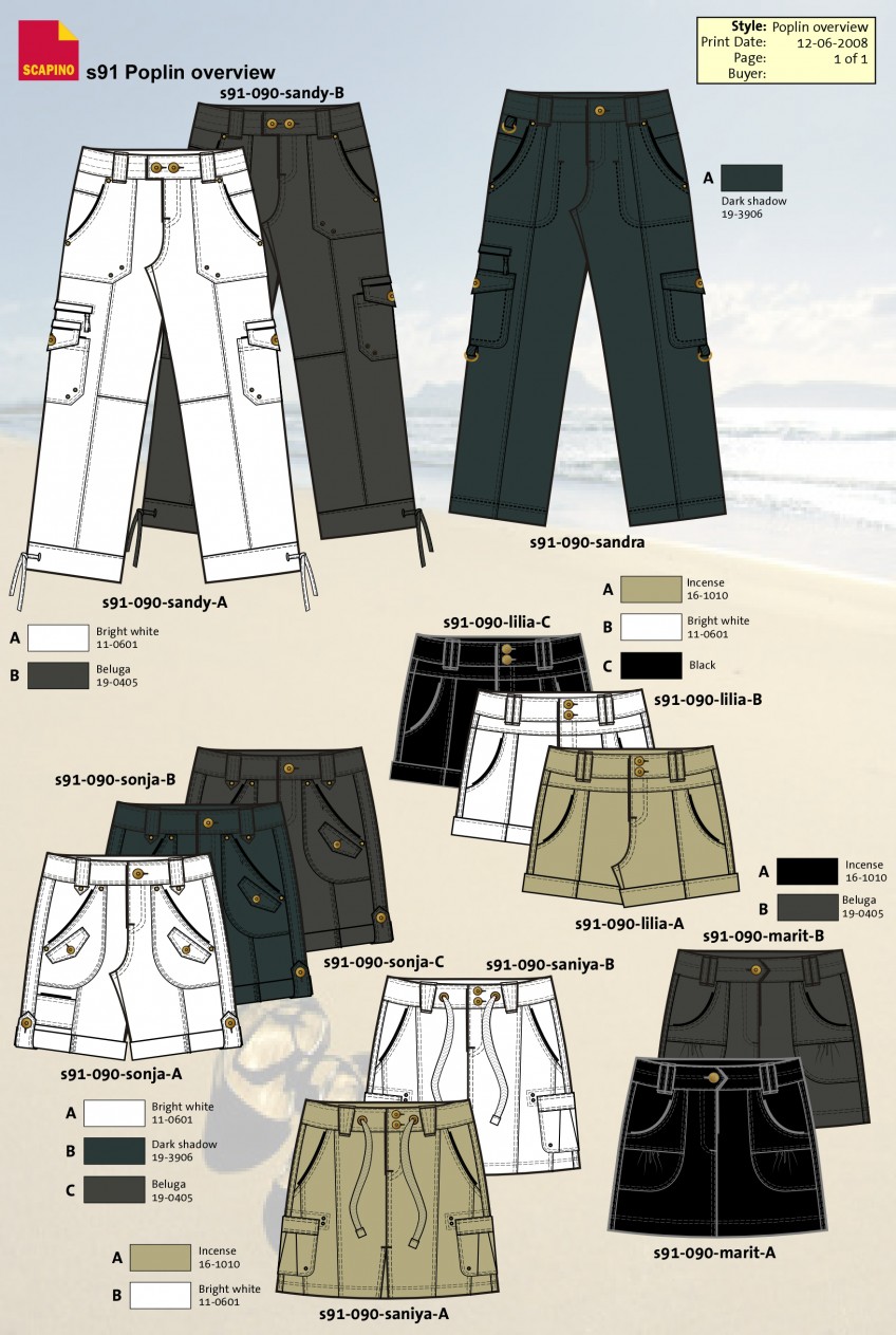 I have designed the whole spectrum of products for women, such as coats, jackets, shirts, sweats, pulls, pants, skirts, etc. Including patterns, prints, labels and hangtags.